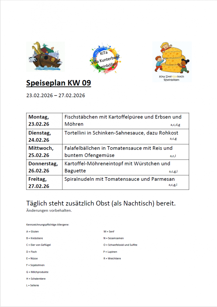 Speiseplan Share on facebook Share on twitter Share on linkedin Speiseplan KW 9 von Fabienne Schüler 20. Februar 2026 PreviousSpeiseplan KW 8 Fabienne Schüler All Comments Speiseplan Speiseplan KW 9 Speiseplan Speiseplan KW 8 Kalender Termine 2025/2026